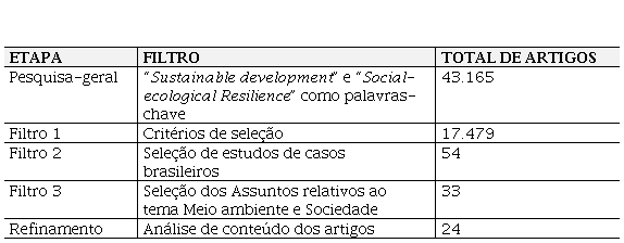 Na pesquisa geral foi incluso o termo “resilience” e “sustainabledevelopment” alcaçando 43.165 textos entre 2000 e 2020. No filtro 1 refinou-se a pesquisa para apenas apresentar artigos científicos revisado por pares. No segundo filtro, refinou-se a pesquisa para apresentar estudos de caso brasilieiros. Este filtro limitou a 54 artigos demonstrando que existem poucos trabalhos práticos relacionados aos termos pesquisados. No terceiro filtro, foram selecionados assuntos relativos ao binômio meio ambiente e sociedade, permitindo limitar os resultados para 33 artigos. Este filtro foi aplicado porque identificou-se, por meio da leitura dos artigos selecionados, estudos fora do assunto de interesse desse artigo a exemplo: resiliência humana na área da psicologia. A pesquisa foi atualizada para o mês de setembro de 2020.