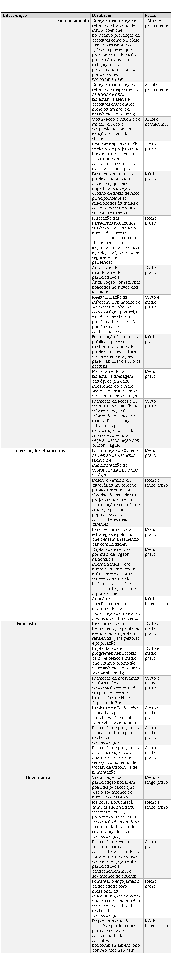 É importante lembrar que cada categoria de intervenções opera em uma escala de tempo diferente, sendo que é muito complicado se pensar ações gerais que abordem diferentes eventos e escalas territoriais e de recursos. No entanto, como forma de sistematizar uma agenda que sirva para orientar possíveis futuros trabalhos propõe-se a elaboração de uma matriz de estratégias do que poderá ser implantado (curto, médio e longo prazo) em cada uma das quatro categorias de intervenção para cada temática apontada pela pesquisa bibliométrica.