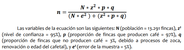 El cálculo del tamaño de la muestra tuvo en cuenta que los datos de la Federación Nacional de Cafeteros (CCH-FNC-SICA, 2019) para 2018 indican la existencia en Pitalito de 13.291 fincas cafeteras y 10.804 caficultores. Para la determinación del número de encuestas se utilizó el dato de “fincas cafeteras”, en virtud de que es el área cosechada la que determina la producción y no el número de caficultores registrados. Se obtuvo una muestra de 45 encuestados, aplicando la ecuación: