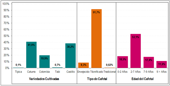 Para 2018 Pitalito tenía 5 variedades de café arábiga cultivadas en 18.194 ha, de las cuales el 41% (7.465,7 ha) eran Caturra, el 38,2% (6.955,9 ha) eran Castillo, el 19,9% (3.621,4 ha) eran variedad Colombia, el 0,7% (136,3 ha) eran Tabi y el 0,1% (14,7 ha) eran variedad Típica. Adicionalmente, se identificó que el 91,7% de los cafetales eran tecnificados (16.677,9 ha), 8,3% estaban envejecidos (1.511,9 ha) y 0,02% eran tradicionales (4,2 ha). Por edad del cultivo, los cafetales entre 0-2 años ocupaban el 18,5% del área total cultivada (3.366,4 ha); los de 2-7 años el 53,1% (9.659,4 ha); los de 7-9 años el 17,4% (3.168,1 ha), y los mayores de 9 años el 11% (2000 ha) (CCH-FNC-SICA, 2019).