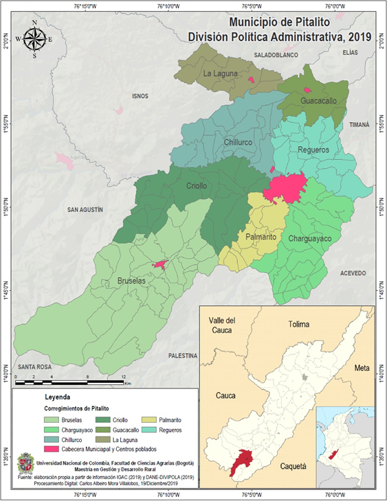 La figura1 muestra la división geográfica del municipio por corregimientos y veredas evidenciando que varios de ellos están distantes del casco urbano principal, lo que le imprime a la vida rural del municipio una marcada identidad con diferencias entre sus comunidades, al punto que tres corregimientos tienen casco urbano propio (Bruselas, La Laguna y Guacacallo). Más aún, el corregimiento de Bruselas, principal productor de café en Pitalito, viene solicitando autonomía político administrativa como municipio desde hace varios años.