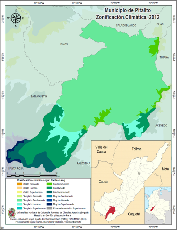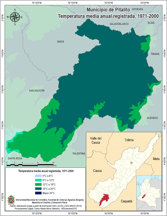En cuanto a la zonificación climática, la figura 3 demuestra la influencia de zonas de clima templado, con diferencias que van desde semiárido hasta superhúmedo, siendo en su mayoría una región predominantemente semihúmeda, siendo muy favorable para el cultivo de café. En efecto, según los registros históricos de temperatura media anual entre 1971 y 2000 zonificados en la figura 4, la mayor parte de Pitalito cuenta con un clima templado relativamente estable entre 18C° y 21C°, propio de alturas entre 1.000 y 1.900 msnm (AMPH, 2019). Estas condiciones naturales, muy adecuadas para el cultivo del café arábiga, son privilegiadas para la producción de alta calidad, cuyos niveles altitudinales ideales están entre los 1.400 y 1.900 msnm. Como se observa en la figura 5, en la diversidad de suelos del municipio predomina el uso agropecuario, junto con algunas coberturas boscosas y zonas con afectación legal.