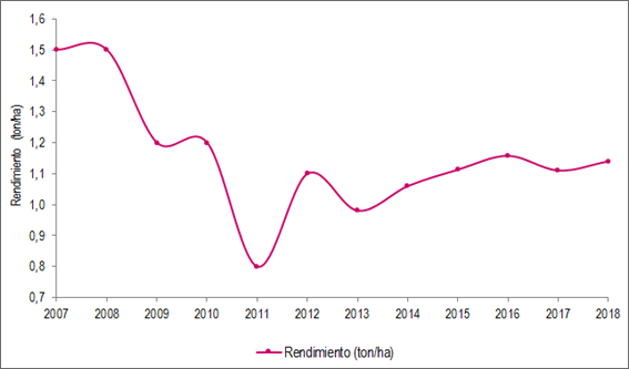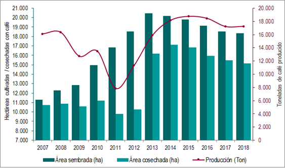 Pitalito es un municipio del departamento del Huila y desde hace varios años ambos lideran la producción cafetera nacional. Según la Federación Nacional de Cafeteros, en 2018 había 22 departamentos cultivando café, de los cuales 8 concentraban el 78,7% del área cultivada equivalente a 690.484 hectáreas: Huila (16,7%), Antioquia (13,8%), Tolima (12,7%), Cauca (10,6%), Caldas (7,5%), Valle del Cauca (6,3%), Santander (5,8%) y Risaralda (5, 3%) (FNC, 2019b). Así mismo, para 2018 la producción nacional alcanzó 13.5 millones de sacos de café verde de 60 Kg (12.75 millones exportados), de los que Huila aportó el 17,7% de la producción de la que, a su vez, el 91,5% fue exportada (FNC, 2019b). Para 2016 el rendimiento del Huila fue de 1,15 Ton/ha, superando el promedio nacional de 0,93 Ton/ha (Agronet, 2019).