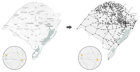 O passo inicial da análise foi a modelagem do sistema espacial do estado do Rio Grande do Sul. A representação utilizada foi a nodal, onde cada cidade do estado é representada por um ponto (nó) e as rodovias entre as cidades representam as conexões (links). Uma vantagem da representação nodal é que ela não apresenta distorções entre as distâncias reais e as distâncias no grafo equivalente.