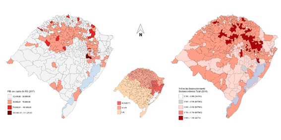 Alonso (2006, p.104) mostra que a participação da região sul no PIB industrial do RS era de 34,57% em 1939, sendo que, nas décadas seguintes, experimentou um persistente processo de desindustrialização relativa, tendo atingido a marca de 9,6% em 2001. Segundo o autor, isso mostra que o parque industrial que se formou nessa parte do estado (processamento de carne bovina, arroz e lã) nunca conferiu à mesma o status de região industrializada. Em contrapartida, as demais macrorregiões (norte e nordeste) foram as principais beneficiárias da expansão industrial ocorrida no estado. A região nordeste vem liderando a produção industrial desde 1939 (47,57%) até 2001 (70,35%) e a região norte vem mantendo relativa estabilidade nesse indicador (17,85% em 1939 e 20,05% em 2001). A Figura 3 ilustra as desigualdades regionais, através dos indicadores de PIB per capita e Índice de desenvolvimento Socioeconômico Total (IDESE).