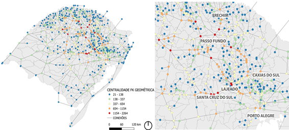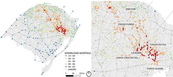 Conforme mencionado, a metodologia proposta neste trabalho envolveu inicialmente a modelagem da rede de municípios do RS e o cálculo das medidas configuracionais de acessibilidade e centralidade da rede espacial, cujos resultados são apresentados nas Figuras 4 e 5.