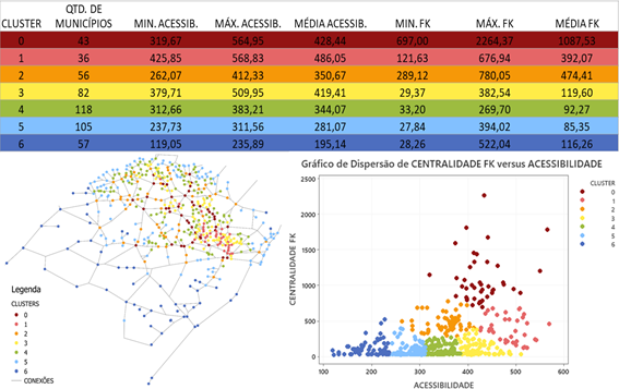 A fim de testar a hipótese deste trabalho, uma segunda análise foi feita considerando que ambas as medidas configuracionais, de forma simultânea, estão relacionadas à presença de atividades econômicas industriais e de serviços. Para isso, foram identificados sete clusters de municípios, utilizando como atributos para o agrupamento os valores de acessibilidade e centralidade FK. A figura 6 apresenta a tabela com os sete clusters, informando quantos municípios, qual o valor mínimo, máximo e a média de Acessibilidade e de Centralidade FK de cada um dos agrupamentos, identificados por cores. Abaixo é apresentando o mapa do RS com a identificação da localização dos municípios formadores de cada um dos clusters por cores. Na direita o gráfico de dispersão, onde o eixo “y” apresenta os valores de Centralidade FK, e no eixo “x” os valores de Acessibilidade, também identificando por cores cada cluster.