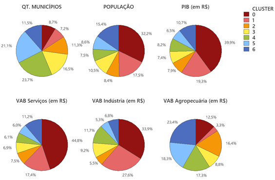 A Figura 6 mostra que o cluster zero (vermelho escuro) reúne os municípios com os maiores valores de acessibilidade e centralidade FK simultaneamente, sendo seguido pelo o cluster um (rosa), também com altos valores de acessibilidade. Os clusters quatro (verde), cinco (azul claro) e seis (azul escuro) são os com menores valores de centralidade e acessibilidade simultaneamente. Os demais clusters identificam grupos com composições diferentes para os valores das medidas. Uma comparação desses clusters de municípios com os indicadores econômicos é apresentada na Figura 7.