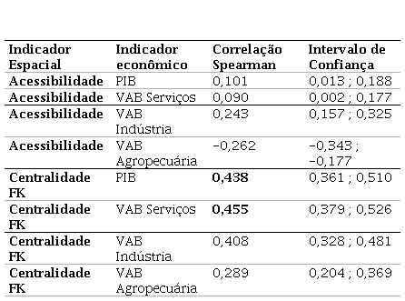 As correlações encontradas foram todas significativas, sendo que valor zero não está incluído nos intervalos de confiança, o que demonstra a existência de correlação estatística entre as medidas configuracionais os atributos econômicos. Pode-se destacar que as correlações mais altas ocorreram entre Centralidade FK e VAB Serviços (0,455) e Centralidade FK e PIB (0,438), sendo estas correlações positivas moderadas. A correlação entre Acessibilidade com o VAB Agropecuária foi negativa, o que significa que quanto maiores valores de Acessibilidade, menores são os valores de VAB Agropecuária. Isso se deve ao fato de que as atividades agropecuárias não seguem o padrão de aglomeração e acessibilidade das atividades industriais e de serviços. A região sul do RS apresenta uma rede regional mais rarefeita, com menor quantidade de ligações rodoviárias e grandes distâncias entre seus núcleos urbanos, diminuindo dessa forma seus valores de acessibilidade. O PIB, que envolve a riqueza total produzida pelos municípios teve correlação mais forte com a Centralidade FK (0,438) do que com a Acessibilidade (0,101), evidenciando o papel da localização estratégica dos municípios.