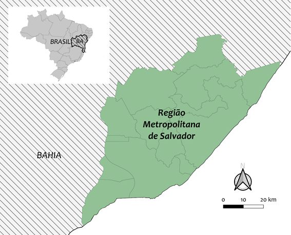 Nesse sentido, este estudo pretende traçar o perfil demográfico e socioeconômico da geração de jovens ‘nem nem’ residentes na Região Metropolitana de Salvador (RMS), dado que a maioria dos estudos foram para o Brasil, com poucos para as metrópoles brasileiras, em especial a RMS, marcada por elevada concentração populacional, desemprego e subemprego, notadamente entre os jovens. Para o alcance dos objetivos propostos a principal fonte de informações foram os microdados da Pesquisa Nacional por Amostra de Domicílio (PNAD) do ano de 2015, disponibilizados pelo IBGE. A extração, manipulação dos dados e elaboração das tabelas fez uso do software estatístico SPSS (Statistical Package for the Social Science), STATA 13 e do programa Excel. Já o mapa de localização foi confeccionado com o softaware livre QGis (versão 2.18.12).