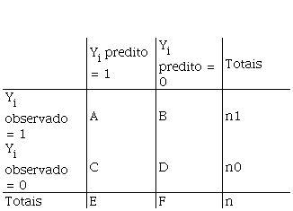 A e D representam os números correspondentes as previsões acertadas do modelo, enquanto B e C quantificam as previsões erradas. Assim, (A+D)/n mostra o percentual de acertos do modelo, ao passo que a proporção de observações erradamente classificadas, (B+C)/n, é a chamada taxa aparente de erro.