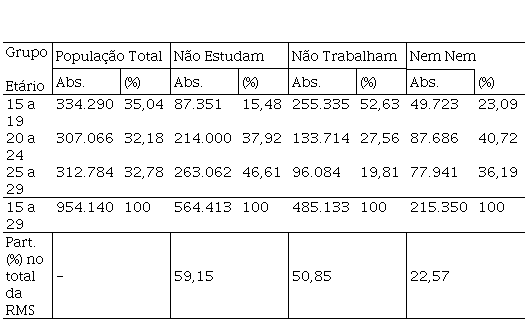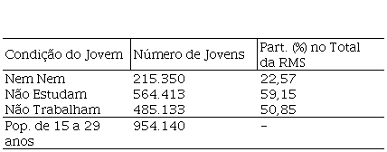 O objetivo deste estudo foi saber quantos são e quem são os jovens nem nem residentes na Região Metropolitana de Salvador. O tema proposto é debatido mundialmente, mas para a metrópole baiana, caracterizada por elevada concentração populacional, desemprego e informalidade, especialmente entre os jovens de 15 a 29 anos, não se conhece estudo para essa área metropolitana.