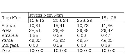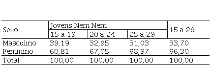 Por sua vez, à medida que aumenta a idade, cresce o percentual de jovens que não estudam e diminuem os que não trabalham. Assim, a maior participação dos nem nem é no grupo de idade intermediário, 20 a 24 anos (40,72%), no momento de transição entre a escola e o trabalho.