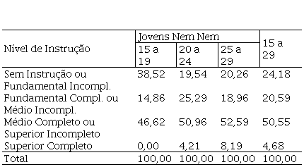 Quanto ao nível de instrução, a Tabela 5 mostra que cerca da metade dos jovens nem nem tem no mínimo o ensino médio completo, o que não é um bom resultado, pois se trata de jovens que não estão estudando e não estão trabalhando, e indica dificuldades de continuar se qualificando ou de inserção no mercado de trabalho.