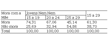 Quanto aos jovens nem nem que moram ou não com a mãe, os dados da Tabela 6 mostram percentuais mais expressivos para aqueles que moram com a mãe, especialmente nos dois primeiros grupos de idade (74,31% e 67,06%). Assim, observa-se clara relação entre o aumento da idade e a saída da casa dos pais, já que entre 25 e 29, a maioria (54,86%) não mora com a mãe. Portanto, dos 15 aos 29 anos, mais de 60% dos jovens nem nem da RMS moram com a mãe, contra menos de 40% que ‘não mora’. O resultado é esperado, em se tratando dos jovens nem nem, pois devido não trabalhar não teria condições para estabelecer/manter um domicílio. Estes resultados vão de encontro com o estudo de Figueiredo e Almeida (2017), mas diferem da pesquisa de Shirasu e Arraes (2019), que mostram que morar com a mãe arrefece a chance do jovem ser nem nem.