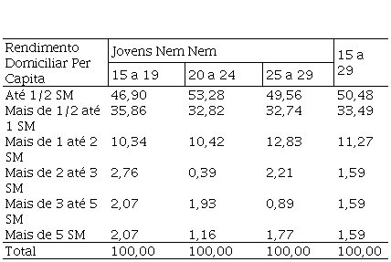 A Tabela 7 mostra o perfil do jovem nem nem quanto ao rendimento domiciliar per capita. Vê-se que predomina a faixa de menor rendimento, com percentual geral (15 a 29 anos) de 50,48%, ganhando até ½ salário mínimo. Ademais, 33,49% residem em domicílio com rendimento per capita de meio a 1 salário. Já a participação de jovens com rendimento domiciliar per capita acima de 2 salários não chega a 5%. Esta concentração nas menores faixas é observada especialmente no grupo etário intermediário (20 a 24 anos), onde estão grande parte dos nem nem.