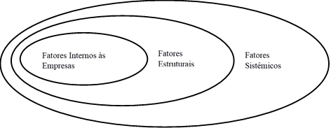 Não foram identificados fatores exclusivamente de ordem estrutural. Assim sendo, fatores, tais como conjuntura e retração do mercado, em parte devidos a fatores estruturais, apresentam, também, vinculações sistêmicas. A falta de clientes decorre das três ordens de fatores que afetam a competitividade. A falta de capital de giro e a dificuldade no acesso ao crédito são devidas a fatores internos e estruturais, mas sob influência de fatores sistêmicos.