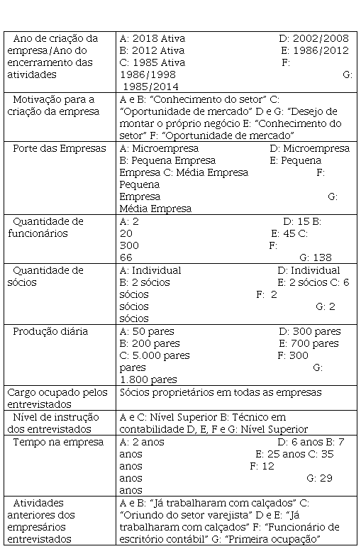 No Quadro 2, estão apresentadas as características dos dois grupos de empresas e dos empresários entrevistados a elas vinculados: a) empresas A, B e C em funcionamento e b) empresas D, E, F e G, que encerraram atividades. As informações quantitativas sobre as empresas que encerraram suas atividades se referem ao ano de encerramento e sobre as ativas ao final de 2019 e início de 2020, quando foram feitas as entrevistas.