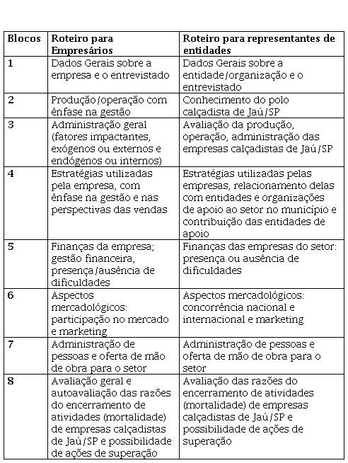 A pesquisa de campo, realizada no polo calçadista de Jaú/SP, foi desenvolvida por meio de consulta a documentos disponíveis, junto a entidades do município e em material de divulgação, neste caso na imprensa de Jaú/SP e região. A prioridade, no desenvolvimento da pesquisa de campo foi dada à realização de entrevistas, a partir de três roteiros, com alguma variação entre eles, conforme o “tipo” de entrevistado: a) empresários cujas empresas se mantêm em atividade; b) ex-empresários, cujas empresas encerraram suas atividades e c) representantes de entidades que se articulam com o setor calçadista de Jaú/SP. Junto aos empresários, foram buscadas informações, sobre eles e sobre suas empresas, relativas à atividade produtiva lato sensu e o desempenho delas (dentre outros, aspectos produtivos, administrativos, gerenciais, financeiros, mercadológicos, comerciais, estratégicos e de avaliação das razões da mortalidade de empresas do setor). Em relação aos representantes de entidades, procurou-se extrair informações sobre desempenho, problemas, dinâmica, possibilidades de apoio e perspectivas para o setor e para o polo. Por meio do roteiro, procurou-se apreender, na percepção dos entrevistados, as razões da mortalidade, devidas a fatores internos, estruturais e sistêmicos e decorrentes do tipo de inserção das empresas no polo, bem como as possibilidades de dinamização da atividade calçadista.