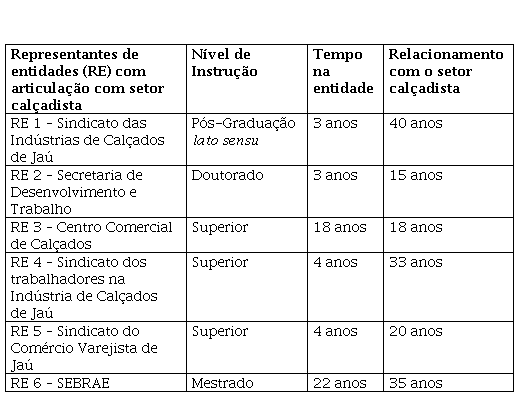 As entrevistas com os seis representantes/dirigentes de entidades que se articulam com o polo calçadista de Jaú/SP possibilitaram ampliar o conhecimento do setor e a identificação de seus pontos frágeis e fortes, de uma perspectiva “mais distante” do que a assumida pelos empresários, ampliando a possibilidade de identificação de fatores estruturais e sistêmicos, bem como referentes à inserção das MPE no setor calçadista e as dificuldades e possibilidades de dinamização de ações ao interior do polo.