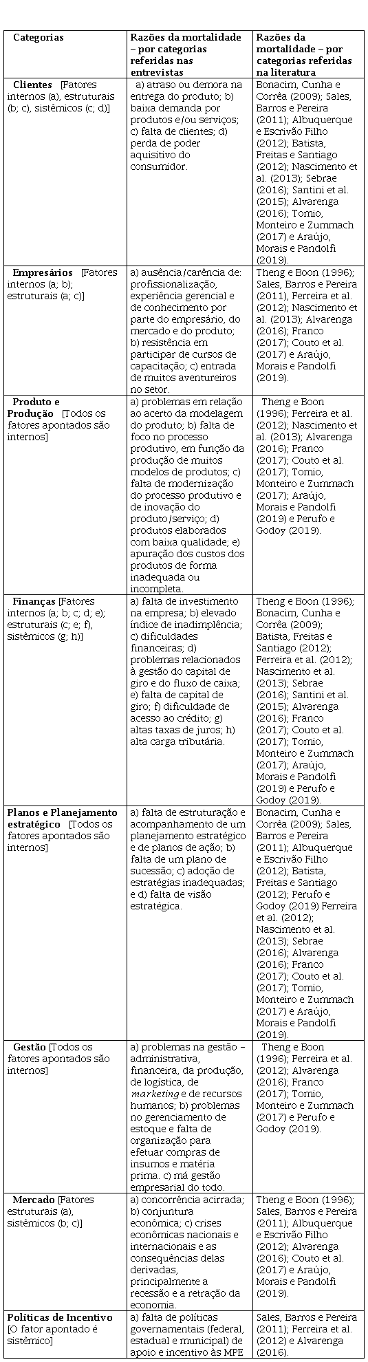 Praticamente todas as razões de mortalidade referidas pelos entrevistados são tratadas por autores na literatura referenciada, conforme o apresentado no Quadro 4. O que se observou foram algumas especificidades relacionadas ao processo produtivo das empresas e algumas peculiaridades do polo calçadista de Jaú/SP.