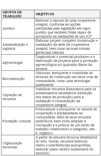 Dessa forma, as ações do programa articularam um conjunto de parcerias para viabilizar o projeto na comunidade, incluindo o governo estadual do Tocantins, outras universidades e entidades de apoio e fomento à economia solidária e à agricultura familiar. O quadro 1 sintetiza os grupos de trabalho constituídos e seus respectivos objetivos.