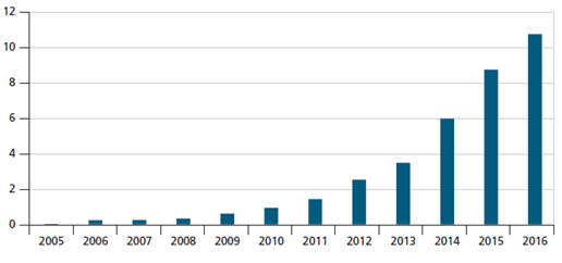 O impacto promovido pela expansão pode ser visualizado na Figura 2. Conforme apontam os estudos da Abeeólica (2017) e Losekann (2018), o Brasil chegou a alcançar a 9ª posição em capacidade instalada e o 5º país que mais adicionou a sua capacidade de geração de energia eólica, demonstrando que o investimento e as ações propostas, ainda em 2002, estão surtindo o efeito desejado. O eixo vertical de 0 a 12 representa a quantidade de gigawatts que foram gerados, as colunas referentes aos anos de 2005 a 2016 representa a quantidade de gigawatts gerado por ano. Conforme estudo desenvolvido por Losekann (2018), enquanto em 2005 a geração de gigawatts ficou abaixo de 2 (GW), em 2016 a geração chegou a 10,7 gigawatts, aproximando-se da escala de 12 (GW).