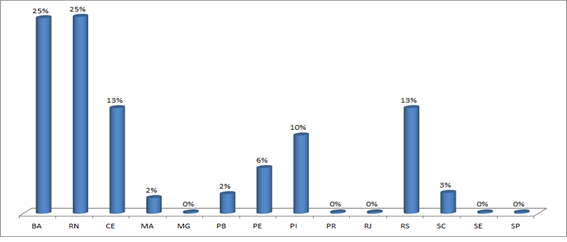 Em continuidade à política de apoio a novas fontes de energia renováveis, a Figura 4 expõe um mapa de participação dos projetos eólicos por estados. Os estados que apresentam percentual de 0% possuem apenas um projeto implantado, e novamente a região Nordeste apresentando forte potencial para geração de energia renovável, assim como no caso da energia fotovoltaica.