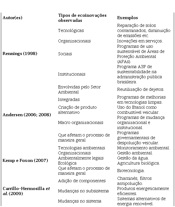 No que se refere à taxonomia da ecoinovação, diversos autores relatam classificações para ecoinovações, como dispõe o Quadro 1: