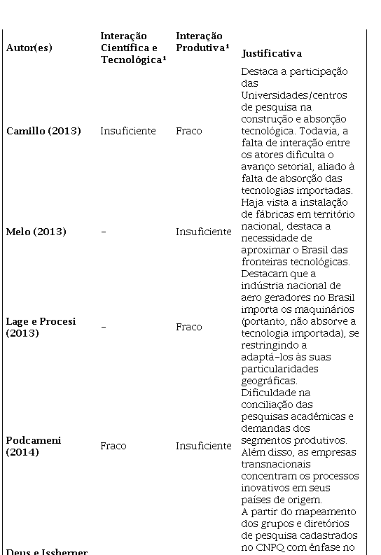 A autora ressalta a necessidade de sinergia entre os três segmentos, o que não é perceptível no Setor Eólico brasileiro. A partir das argumentações do trabalho, é possível concluir uma classificação a partir dos três arcabouços anteriormente mencionados, estabelecendo os seguintes critérios avaliativos para as sinergias: Forte, Insuficiente e Fraco. O quadro 3 apresenta a definição das categorias.