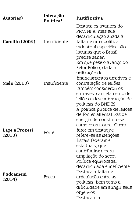 No tocante à interação política, utilizaram-se as seguintes linhas diretoras: (1) políticas industriais e de ciência, tecnologia e inovação para a fonte eólica e; (2) políticas transversais que beneficiem o setor (PODCAMENI, 2014).