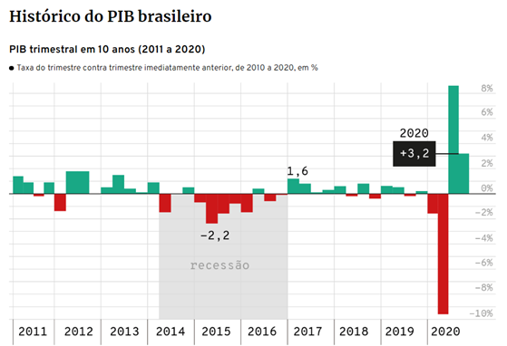 Neste período objeto do estudo, o Produto Interno Bruno – PIB teve oscilações significativas e que podem assumir relações importantes com os recursos investidos nos projetos. No gráfico 01 é detalhado a evolução do PIB brasileiro no período de 2011 a 2020.