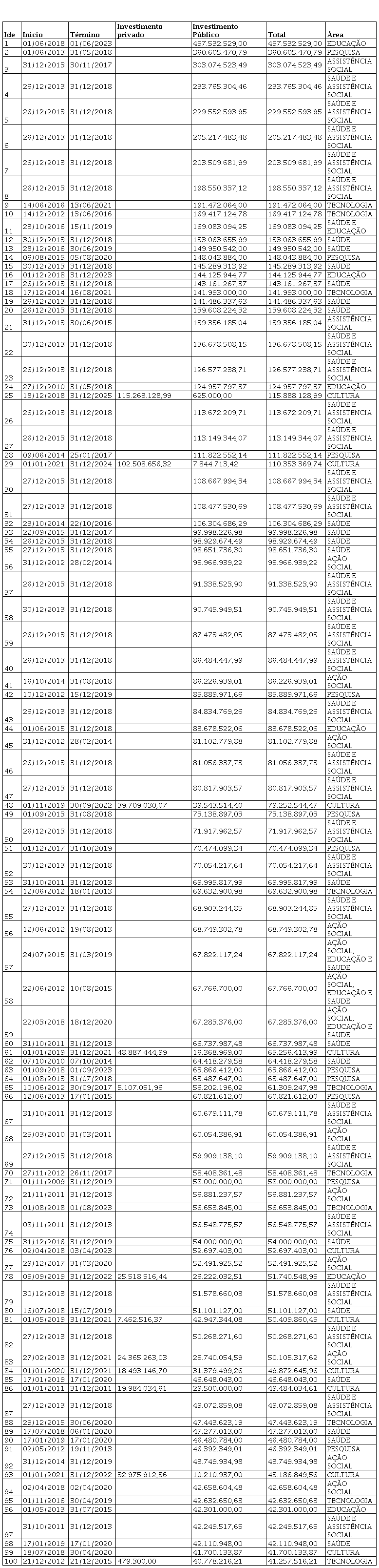 Os achados indicam que dos cem projetos de maior capital investido, cinquenta e um foram da área da saúde, trinta foram da área da assistência social, 13 foram da área da ação social, onze foram da área da pesquisa, dez das áreas da cultura e da tecnologia (cada) e sete foram da área da educação.