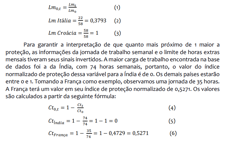 Por exemplo, a licença-maternidade na Itália1, que é de 22 semanas (Lm=22), foi dividida pelo número máximo de semanas de licença-maternidade da amostra Lmax=58, que é o número de semanas de licença-maternidade concedida na Croácia. Dessa forma, o indicador de licença-maternidade da Itália equivale a 0,3793 num intervalo de zero a um. A Croácia, por ser a que possui o maior número de semanas de licença, assume o valor de um nessa variável, representando a maior proteção relativa em termos de licença-maternidade. Esse mesmo procedimento foi utilizado para todas as variáveis que precisam de normalização.