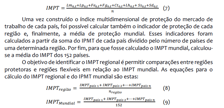 Uma vez calculado o valor normalizado para cada uma das variáveis em cada país, passa-se à construção do índice de proteção, com base na média aritmética dos indicadores normalizados. O objetivo do IPMT é identificar países com legislação mais protetora ou menos protetora, sem atribuir juízo de valor ao número encontrado. Ou seja, o objetivo não é atribuir graus de importância subjetivos às variáveis, mas somente identificar países flexíveis e países protetores que permitam análises e comparações entre países. Esse método está demonstrado na equação abaixo, criada para o cálculo do IP de cada país: