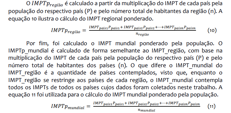 Considerando essa realidade, observam-se, na Tabela 4, os IMPTs das regiões com média ponderada pela população dos países (a descrição do cálculo consta na metodologia, apresentada na seção 3).