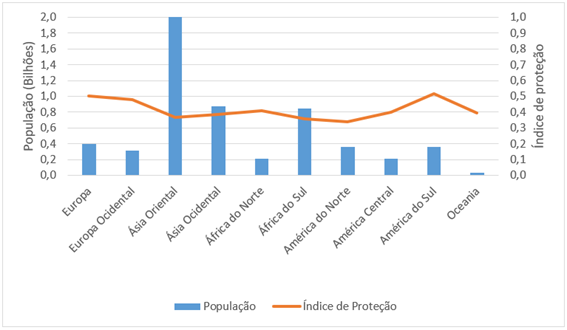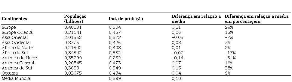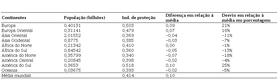 Observamos, na Tabela 3 que as três regiões mais protetoras são a América do Sul, com 0,518, seguida da Europa ocidental, com 0,503, e da Europa Oriental, com 0,479, todas com significativos desvios acima da média mundial. A Europa ocidental e a América do Sul apresentam desvios acima de 20% em relação à média mundial, que, conforme metodologia aplicada, ficou em 0,414.