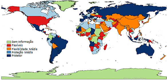 A Figura 1 ilustra o nível de proteção nos países, divididos em quatro partes proporcionais. Os países de cor azul-escura são os países do primeiro quartil (os mais protetores do mundo, com indicadores de proteção acima de 0,48).