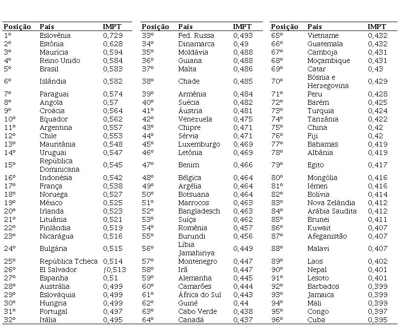 Com base nos resultados apresentados, é possível observar que o país com legislação trabalhista mais protetora do mundo, considerando-se a amostra dos 152 países, é a Eslovênia, com IMPT de 0,729. Já o país com legislação mais flexível, ocupando o último lugar no ranking, é a Suazilândia, com IMPT de 0,182.