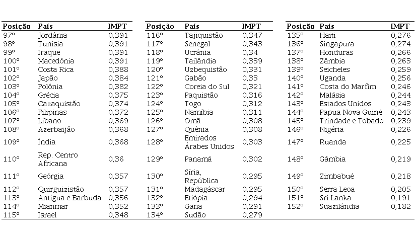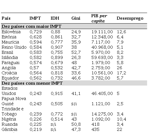 Adicionalmente, é possível comparar o IMPT com os indicadores socioeconômicos importantes e tradicionalmente utilizados nas análises do desenvolvimento dos países. Para fins de ilustração, na Tabela 5 são apresentados os dez países com melhor e pior posição no IMPT em comparação com IDH, índice de Gini, PIB per capitae desemprego.