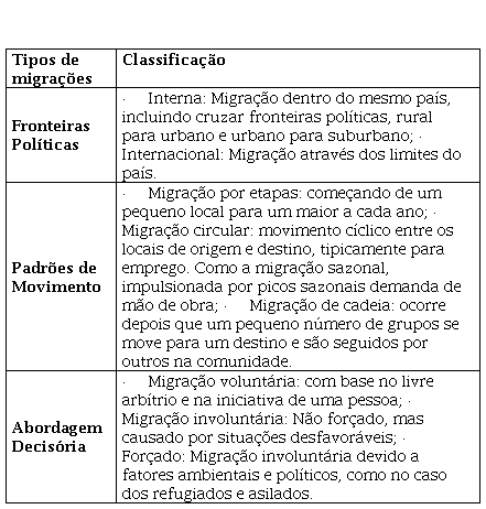 Existem três tipos de migrações, de acordo com o World Economic Forum (2017). Elas podem se classificarem em: a. fronteiras políticas, que diz respeito à migração interna realizada dentro do próprio país ou para outros países; b. padrões de movimento, que se caracterizam em migrações realizadas em etapas, de um pequeno local para outro maior, migrações circulares influenciadas pelos ciclos sazonais e as migrações em cadeia que consistem quando um pequeno grupo toma a iniciativa de migrar para outro local e é seguido por mais pessoas; e c. abordagem decisória, que incluem as migrações voluntárias, impulsionadas por emprego, melhor qualidade de vida e as migrações involuntárias que ocorrem através de situações ambientais, políticas, econômicas, como por exemplo, os refugiados e os asilados, como se pode ver no Quadro 1 (WORLD ECONOMIC FORUM, 2017).