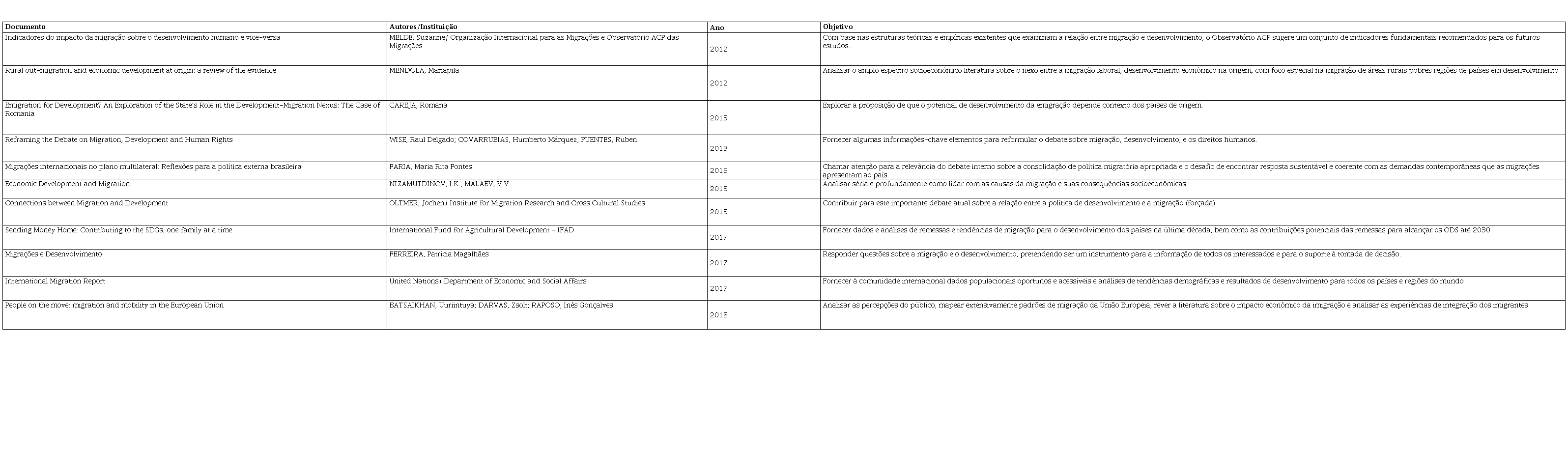 Nesta seção objetivou-se desenvolver categorias relacionadas à ligação da migração com o desenvolvimento encontrada através dos documentos analisados. Foram analisados onze documentos selecionados por meio dos seus objetivos, das contribuições relevantes e da sua relação com o objetivo desta pesquisa. Para melhor esclarecimento, o Quadro 2 traz as informações dos documentos analisados.