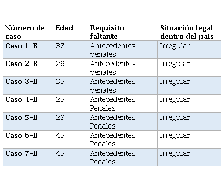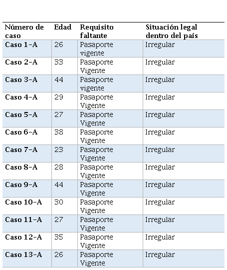 En este acápite, observaremos a través de tablas dinámicas compliladas del trabajo realizado entre la Fundación Fidal y Universidad Internacional SEK, de veinte casos de migrantes que no pudieron obtener su visa de residencia temporal de trabajo debido a la falta de obtención de requisitos, y analizaremos los dos primeros y por último hablaremos de propuestas que podrían ayudar a la crisis migratoria que se vive hoy por hoy en el Ecuador y Latinoamérica, por motivos de confidencialidad se han omitido los datos sensibles como número de cédula y nombres.