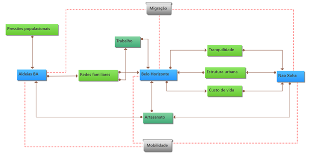 Feita a descrição isolada de cada um dos elementos dinamizadores dos processos de migração e mobilidade espacial dos Pataxó, é preciso avançar no entendimento de como esses elementos foram apresentados pelos entrevistados em termos de relações entre eles e com a rede de localidades descritas na pesquisa de campo. Isso será feito a partir da análise do diagrama explicativo apresentado na Figura 1, onde estão representadas as relações entre as categorias de análise de nosso estudo.