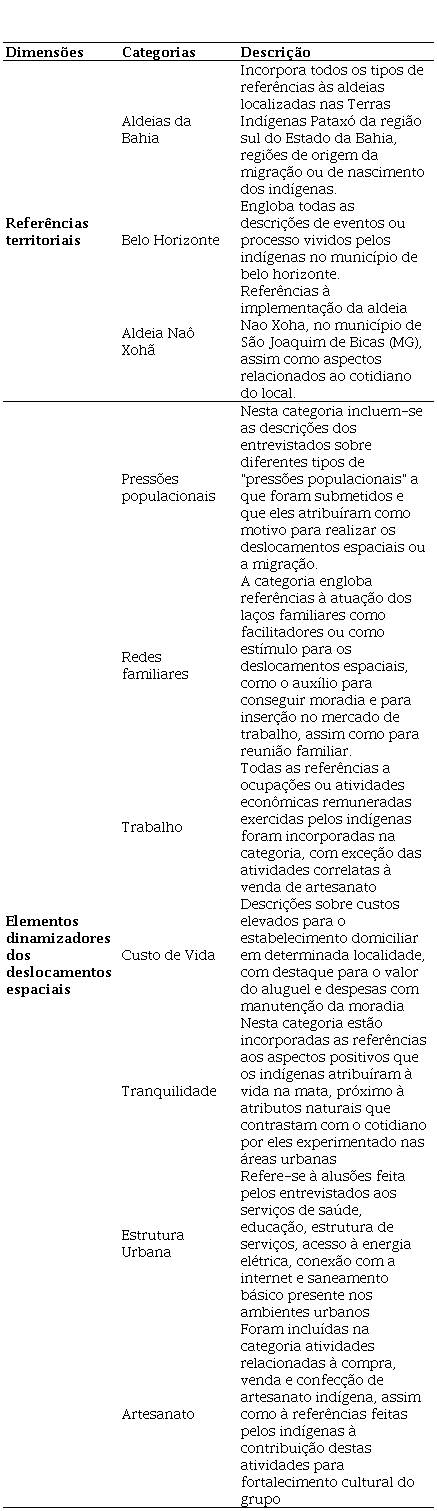 A tabela 1 apresenta as categorias criadas no processo de codificação, divididas em duas dimensões. Na primeira delas, encontram-se as referências territoriais que os indígenas indicaram nas entrevistas, referentes aos locais em que nasceram, para onde se mudaram, onde viviam no momento da entrevista e para onde se deslocavam com regularidade para realizar suas atividades cotidianas. Esses locais incluem o conjunto de aldeias localizadas nas Terras Indígenas Pataxó no sul do Estado da Bahia, onde quase todos os entrevistados nasceram e de onde vieram antes de migrar para algum município da RMBH. A segunda referência espacial recorrentemente citada pelos indígenas é o município de Belo Horizonte, destino inicial da imigração, local onde conseguiram locais de moradia e desempenhos de atividades laborais ao chegar à RMBH, assim como onde buscam serviços para atender suas necessidades. Por fim, a Aldeia Naô Xohã, local de realização das entrevistas, foi a referência territorial principal descrita nas entrevistas, para onde os indígenas migraram após um período de residência em Belo Horizonte.