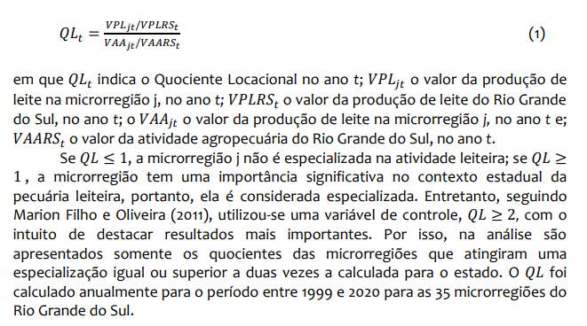 Para Crocco et al. (2003), o Quociente Locacional objetiva comparar duas estruturas setoriais-espaciais, utilizando uma economia de referência. Para saber se determinada microrregião gaúcha é especializada na produção de leite, utilizou-se a Equação em (1), cuja variável-base é o valor da produção: