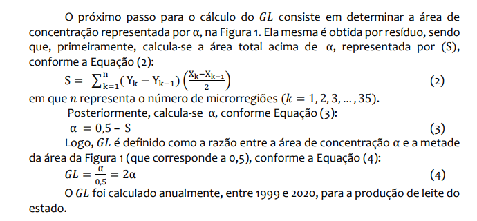 O Gini Locacional (GL) mensura a concentração de uma atividade em determinada região. Nesse estudo, ele mede a concentração da atividade leiteira no Rio Grande do Sul. Analiticamente, esse coeficiente varia de zero a unidade, de acordo com Suzigan et al. (2003), sendo que, quanto mais próximo da unidade mais concentrada está a atividade; por outro lado, se a atividade for uniformemente distribuída, o coeficiente será zero.