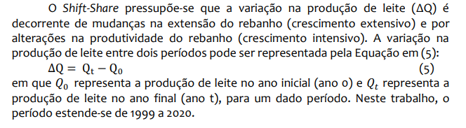 MOURA, A. P. F.; SANTOS, C. V.; BULHÕES, R. Fontes de crescimento da pecuária leiteira paranaense no período 1995-2010: uma análise por mesorregiões à luz do método shift-share. Ciências Sociais em Perspectiva, v. 14, n. 27, p. 65-87, 2015.