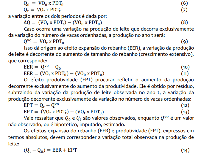A partir de dados relativos à quantidade produzida de leite (Q), em litros, e do número de vacas ordenhadas (VO) relativos a um determinado ano, é possível calcular a produtividade do rebanho (PDT). Portanto, a produção de leite no ano t, pode ser representada por: