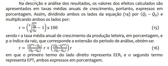 Esse método é tradicionalmente empregado em estudos agropecuários, geralmente para decompor taxas de crescimento da produção agrícola. Seguindo essa linha, esse método é utilizado para decompor o crescimento da pecuária leiteira, baseando-se no método empregado por Raiol et al. (2009), Bastos e Viggiano (2012), Moura, Santos e Bulhões (2015), Pinto e Perobelli (2016) e por Moura e Santos (2017).